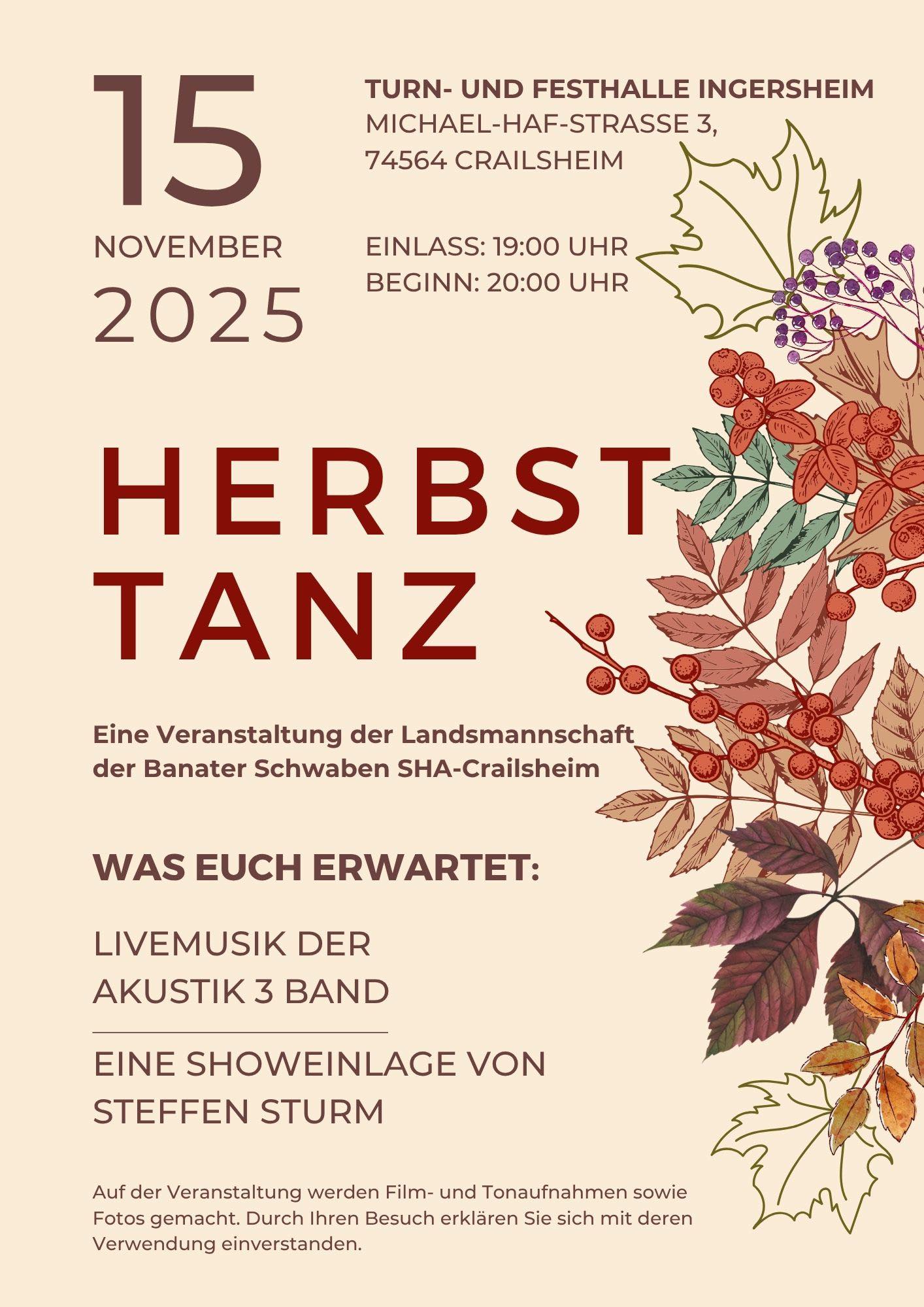Am Samstag, den 27. September 2025 feierte die Landsmannschaft der Donauschwaben Mosbach in der Pattberghalle in Neckarelz ihr 75. Kirchweihfest. Zum Tanz spielte die Böhmisch-Mährische Blasmusik „Die Gschlampadn“. Seitens der Gastgeber wirkten die Jugendtanzgruppe und der Tanzkreis der Donauschwaben Mosbach mit. Einen besonderen Auftritt hatte die sorbische Gruppe, die mit ihren Liedern und Tänzen das Publikum gekonnt unterhielt. Ebenso konnte die Show- und Turngruppe Exotica für einen Auftritt gewonnen werden. Mit 11 Trachtenpaaren und mit Valentin – einem dem Zug vorausgehenden stolzen Schildträger – waren wir Heilbronner die größte Gruppe unter den teinehmenden Gruppen.