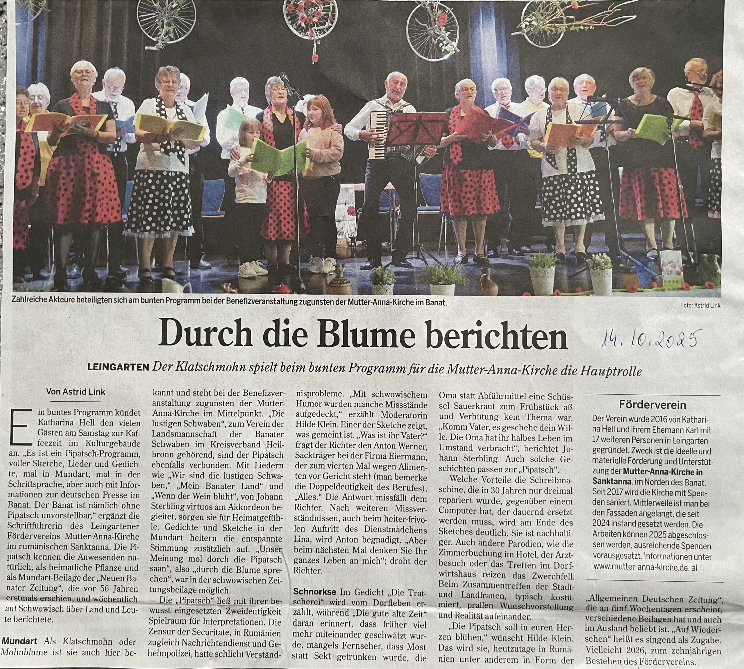 Die Heilbronner Stimme berichtet heute in ihrem Lokalteil von dem Auftritt der Gruppe Lustige Schwaben bei der Benefizveranstaltung zugunsten der Mutter-Anna-Kirche in Sanktanna in Leingarten.