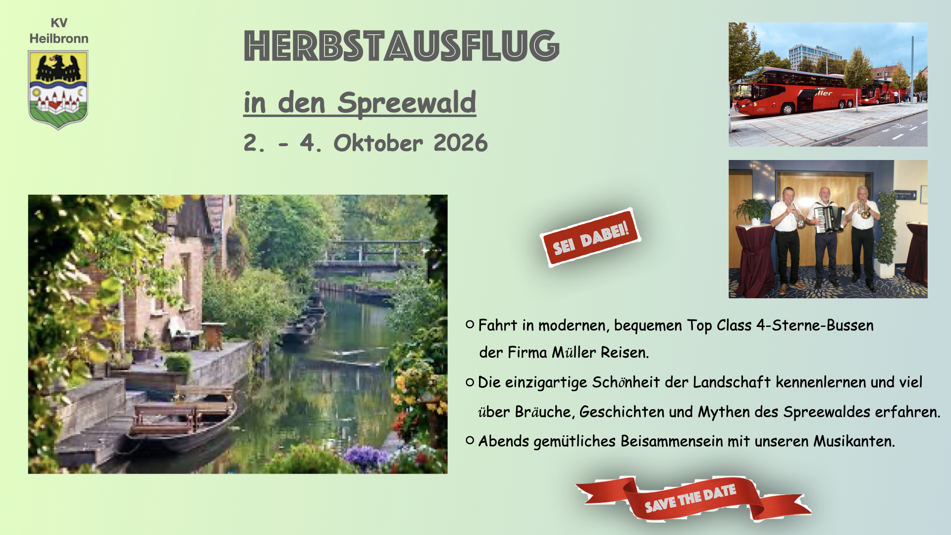Anbei die Beschreibung Herbstausflug in der Hoffnung auf eine gute Resonanz bei den Mitgliedern und unseren Freunden.Damit ich weiß, ob ich einen zweiten Bus bestellen soll bitte ich euch um eine rechtzeitige Anmeldung. Denn der erste Bus ist bereits voll! Und von vier Musikanten (mit ihren Ehefrauen) sind schon Anmeldungen eingegangen!